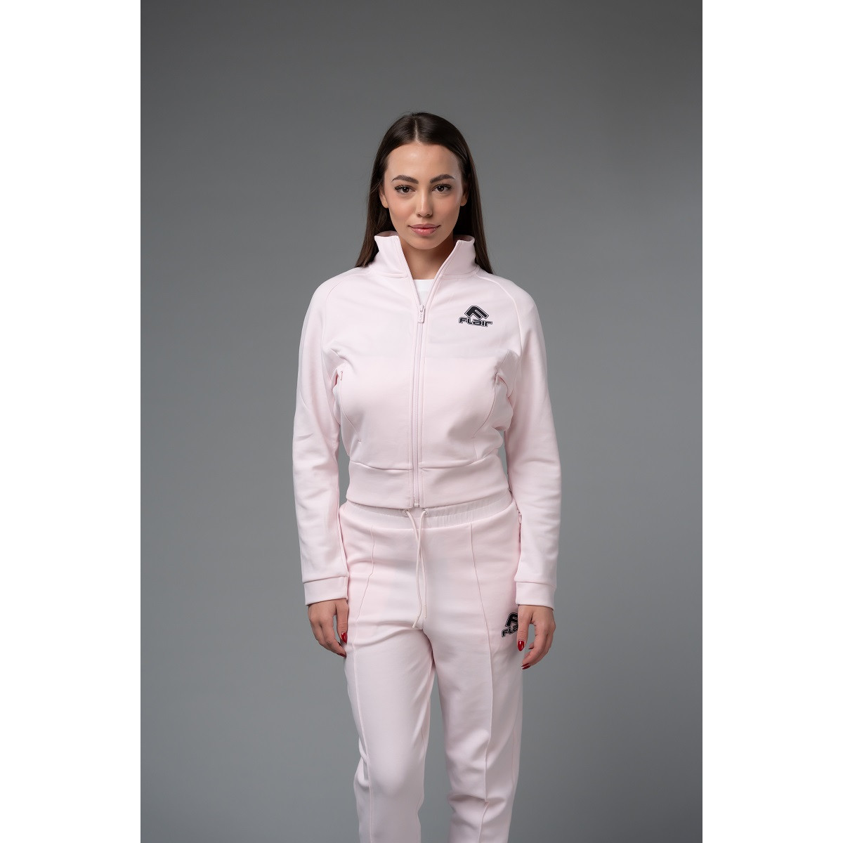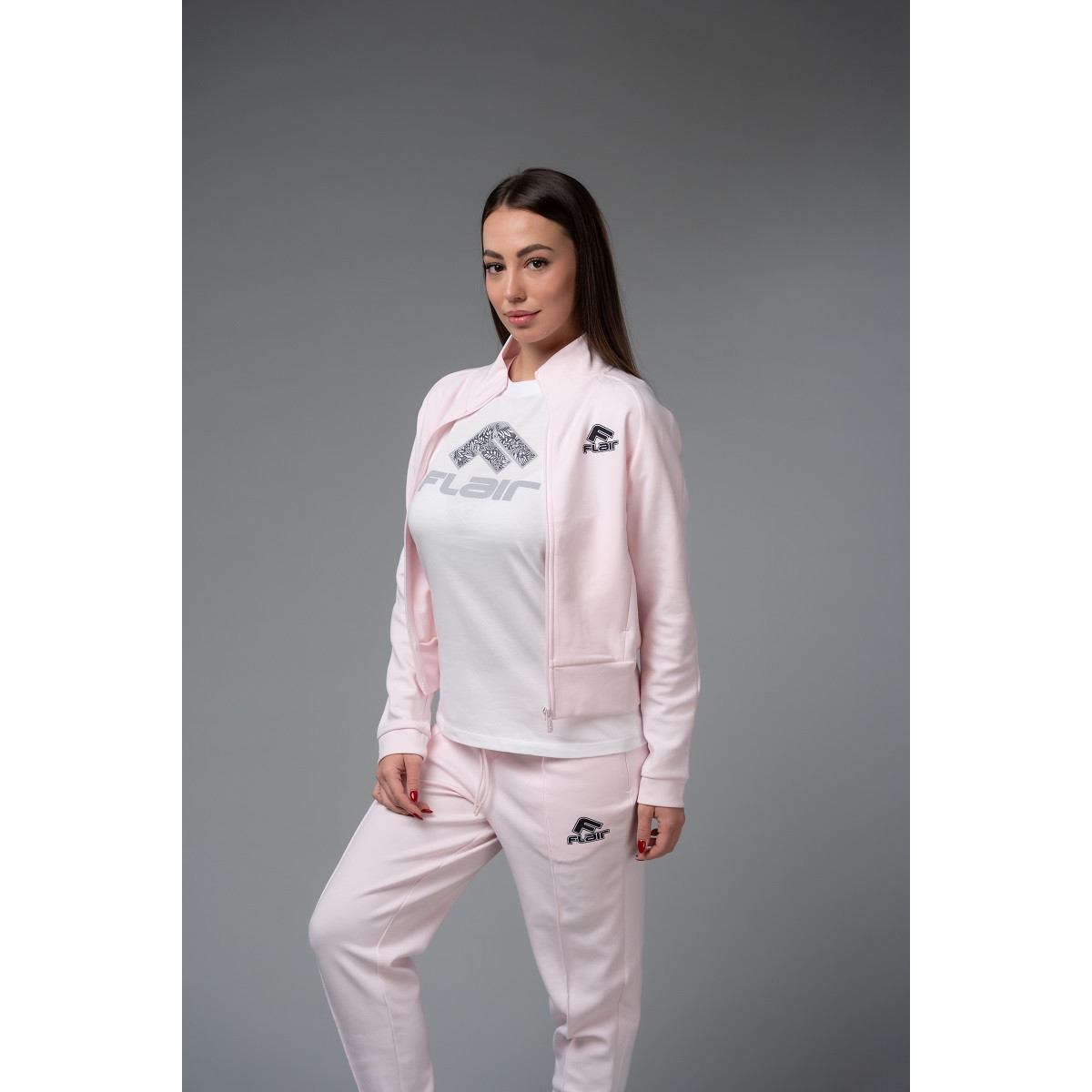 Женска спортска облека од есенската колекција Flair FW24. Мек материјал во розева боја. Врвот е исечен, слободно паѓа до колковите. Дното е на предниот раб по целата должина на нозете. Црното лого FLAIR е во контраст со меката боја на комплетот. Спортскиот аутфит е дел од женски комплет составен од маичка, блуза со долги ракави и долен дел во иста ткаенина и боја. Направете ја вашата најсоодветна комбинација на страницата и нарачајте онлајн.