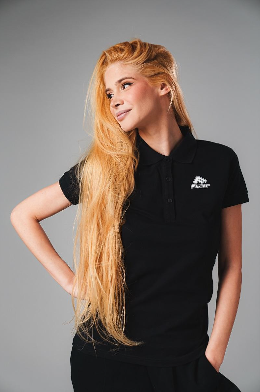 Женска поло маица од FLAIR. Во црно со бело лого. Достапно и во други бои. Универзална комбинација со многу од ставките на страницата.