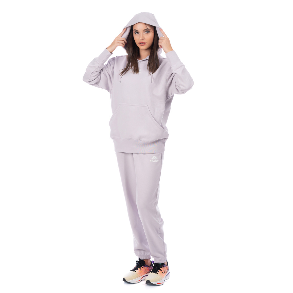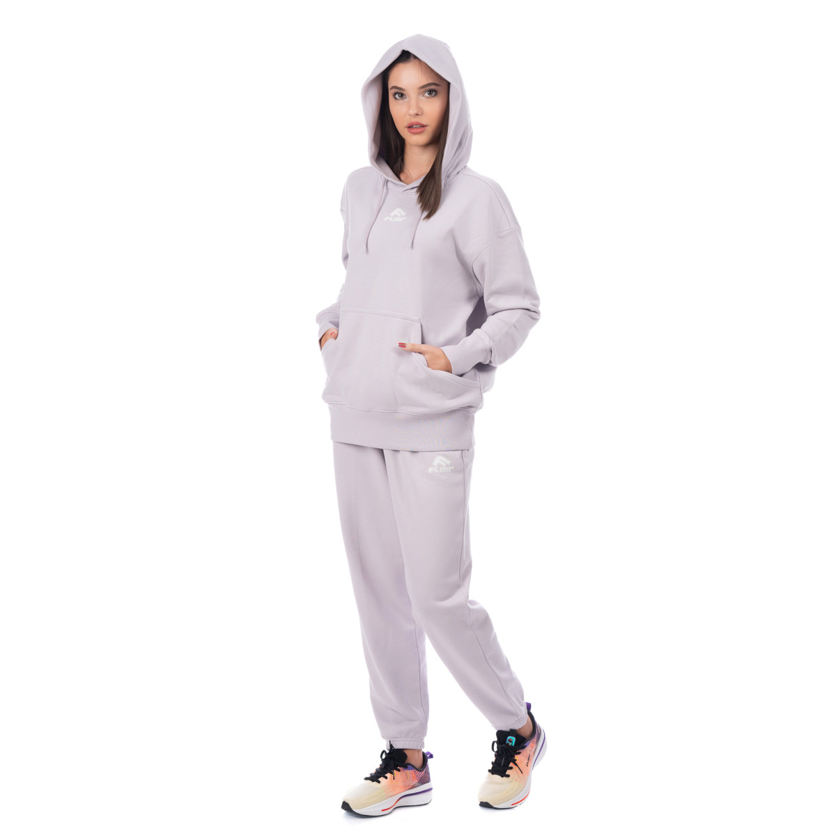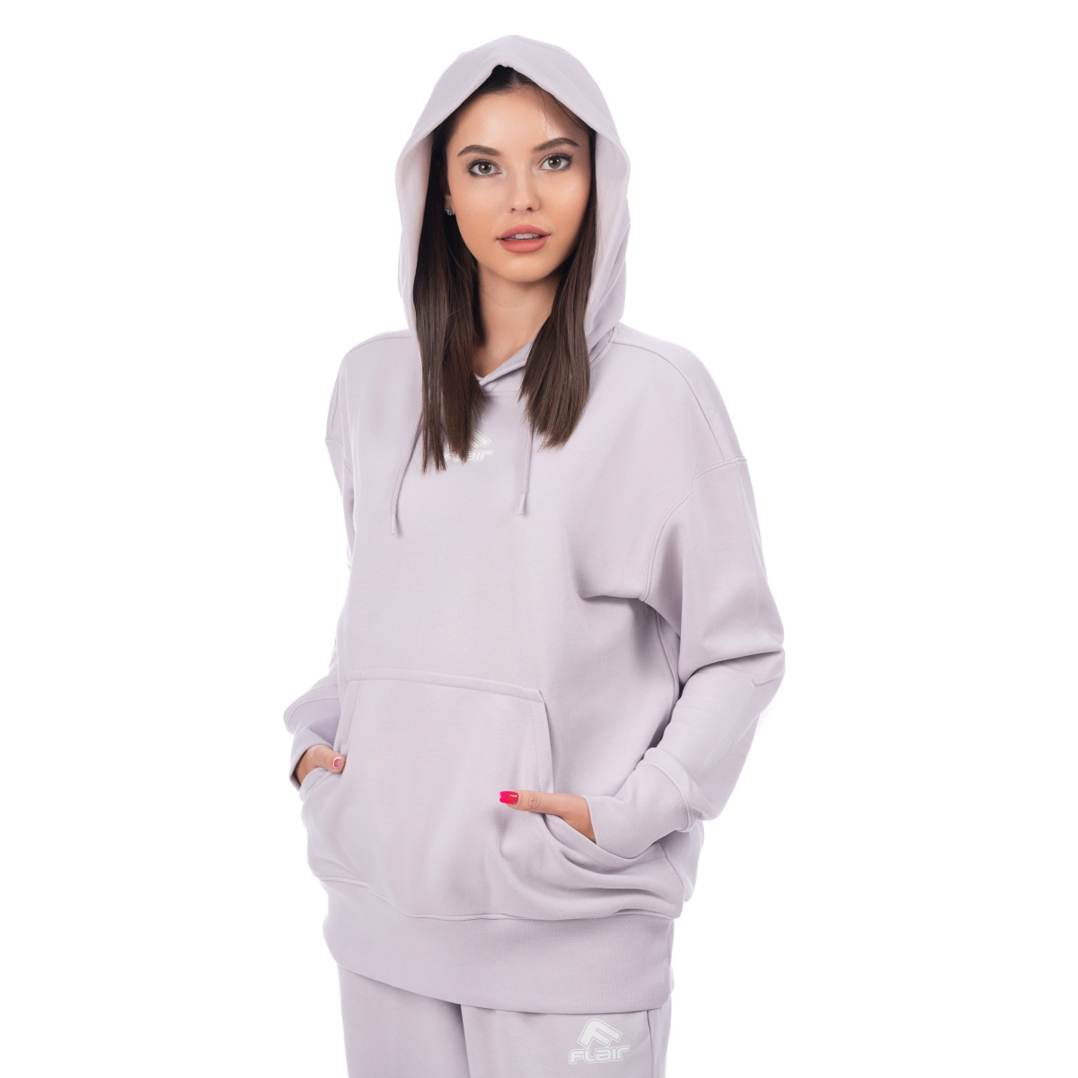 Памучен женски дуксер од есенската колекција FLAIR FW24. Сечењето е предимензионално, бојата е светло виолетова. Бел отпечаток од логото FLAIR се наоѓа на предната страна на дуксерката. Со големи џебови, без преграда. Дуксерот е дел од женски комплет составен од маица, долен дел и спортски аутфит во иста ткаенина и боја. Изберете ја најсоодветната големина и нарачајте онлајн.