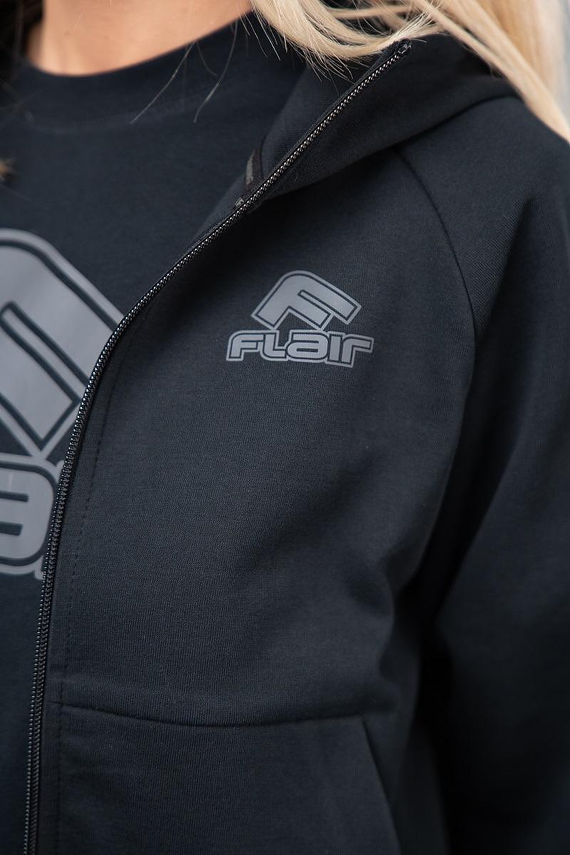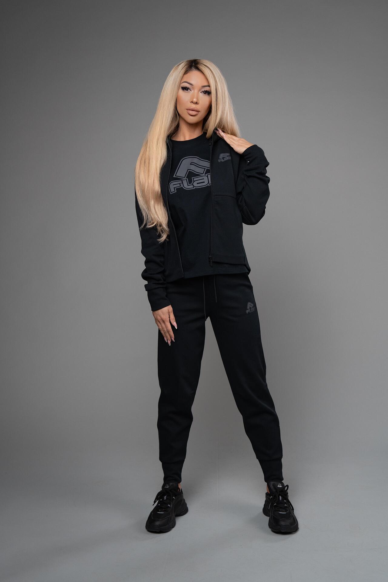Женски тренерки во црна боја, од есенската колекција FLAIR. Материјалот е погоден за пролет. Горниот дел е лабав, заоблен на работ и подолг одзади. Има капа. Џебовите на двата дела се странични и без патент. Изберете ја вашата големина и нарачајте онлајн.