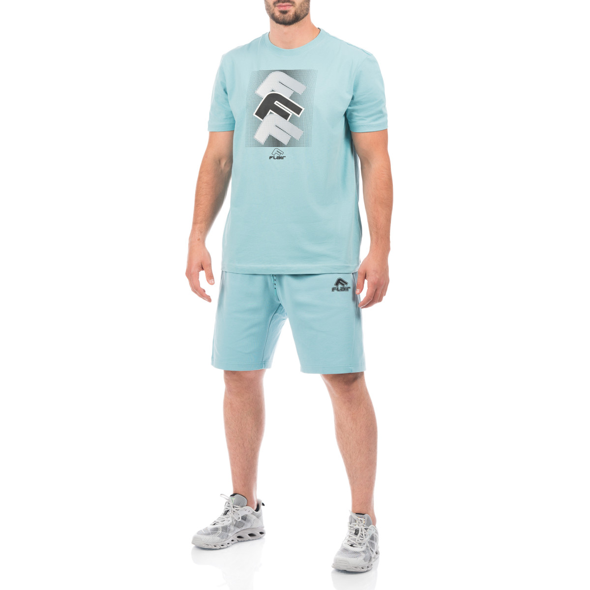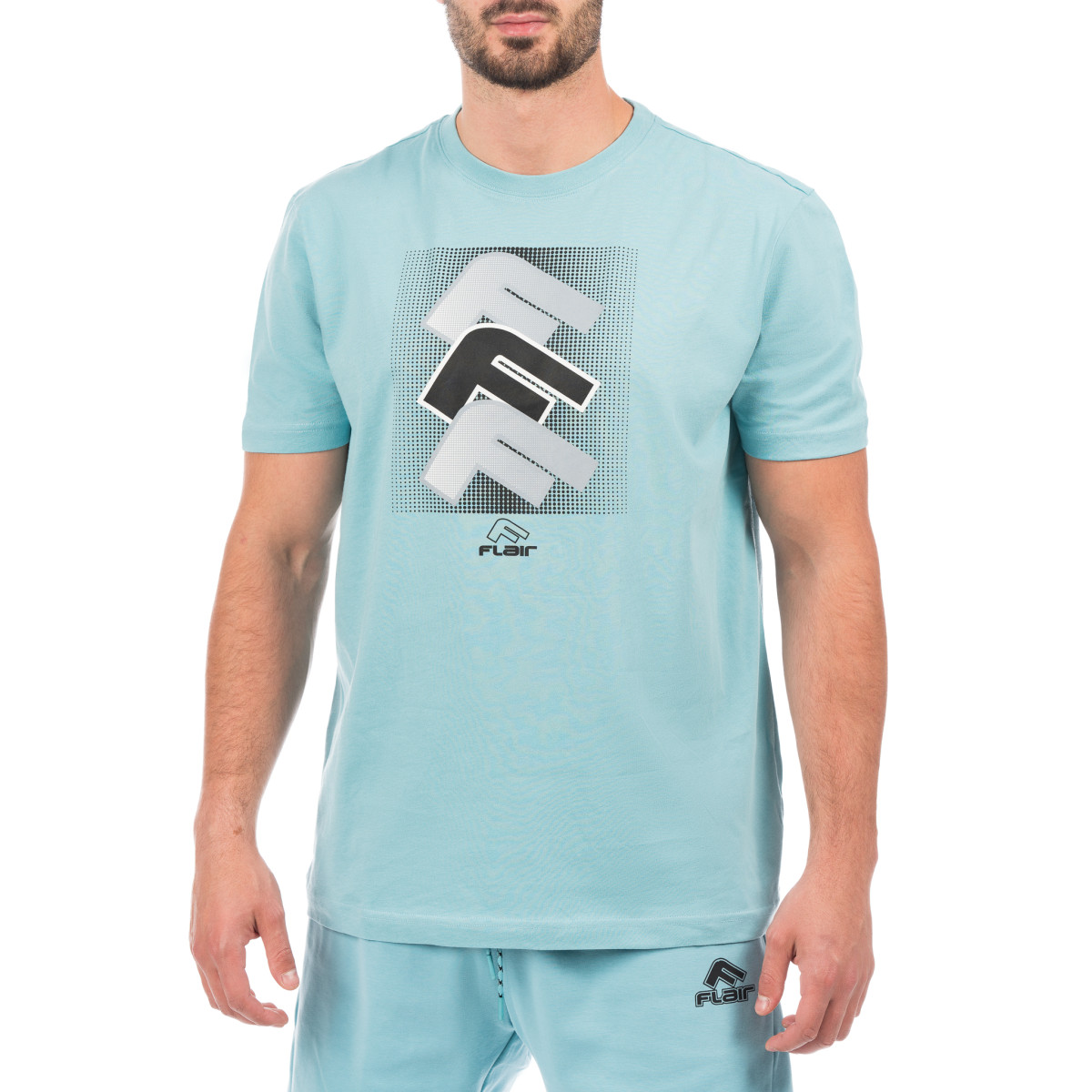 Машка маичка во светло сина боја, дел од летната колекција FLAIR SS24. Принтот е комбинација од сребрена, црна и бела боја, сместена во средината на градите. Маичката може да се комбинира со шорцеви од истата серија.